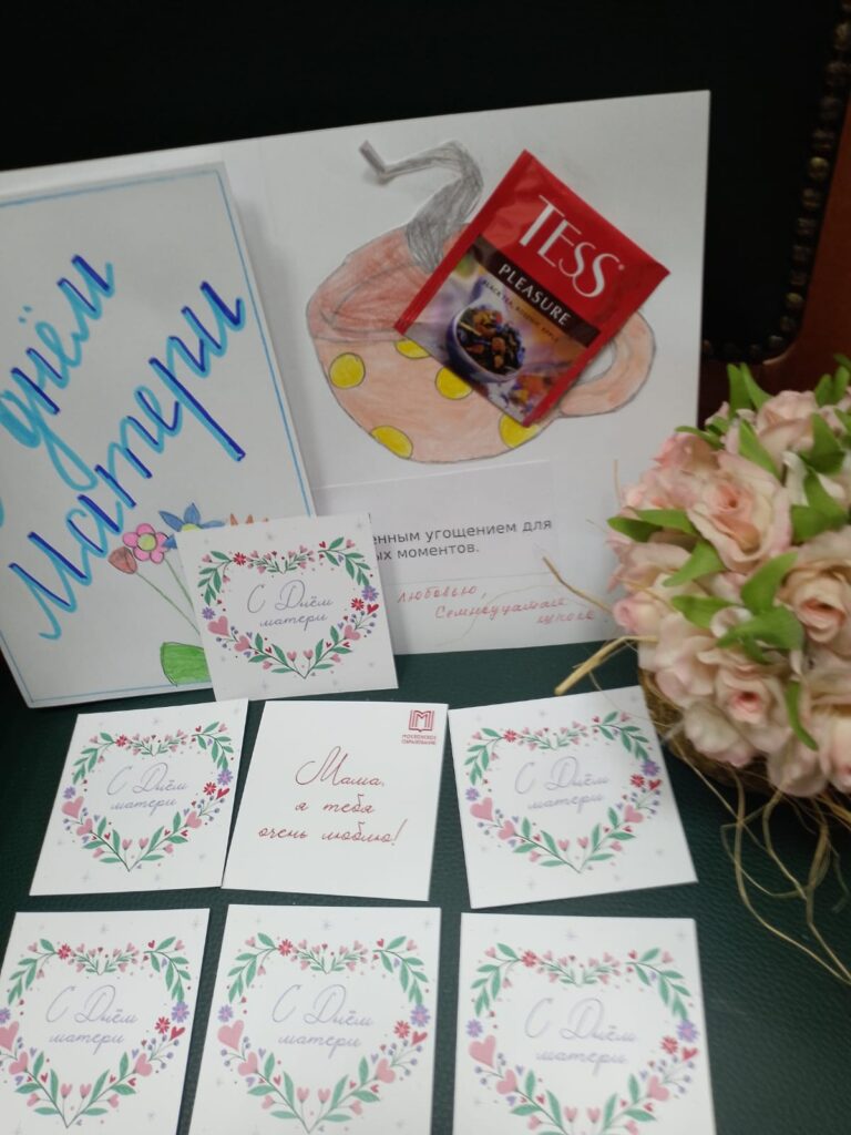 - Памятные подарки — каждой участнице вручили символический подарок: цветы, открытки ручной работы от школьников и памятные сувениры.