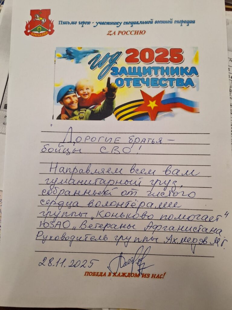 Гуманитарный груз, письма поддержки и пожелания скорейшей Победы регулярно отправляются от организации ЮЗАО союз ветеранов и инвалидов Афганистана ( рук. Владимир Слесарев,) и группы волонтеров » Коньково помогает! «